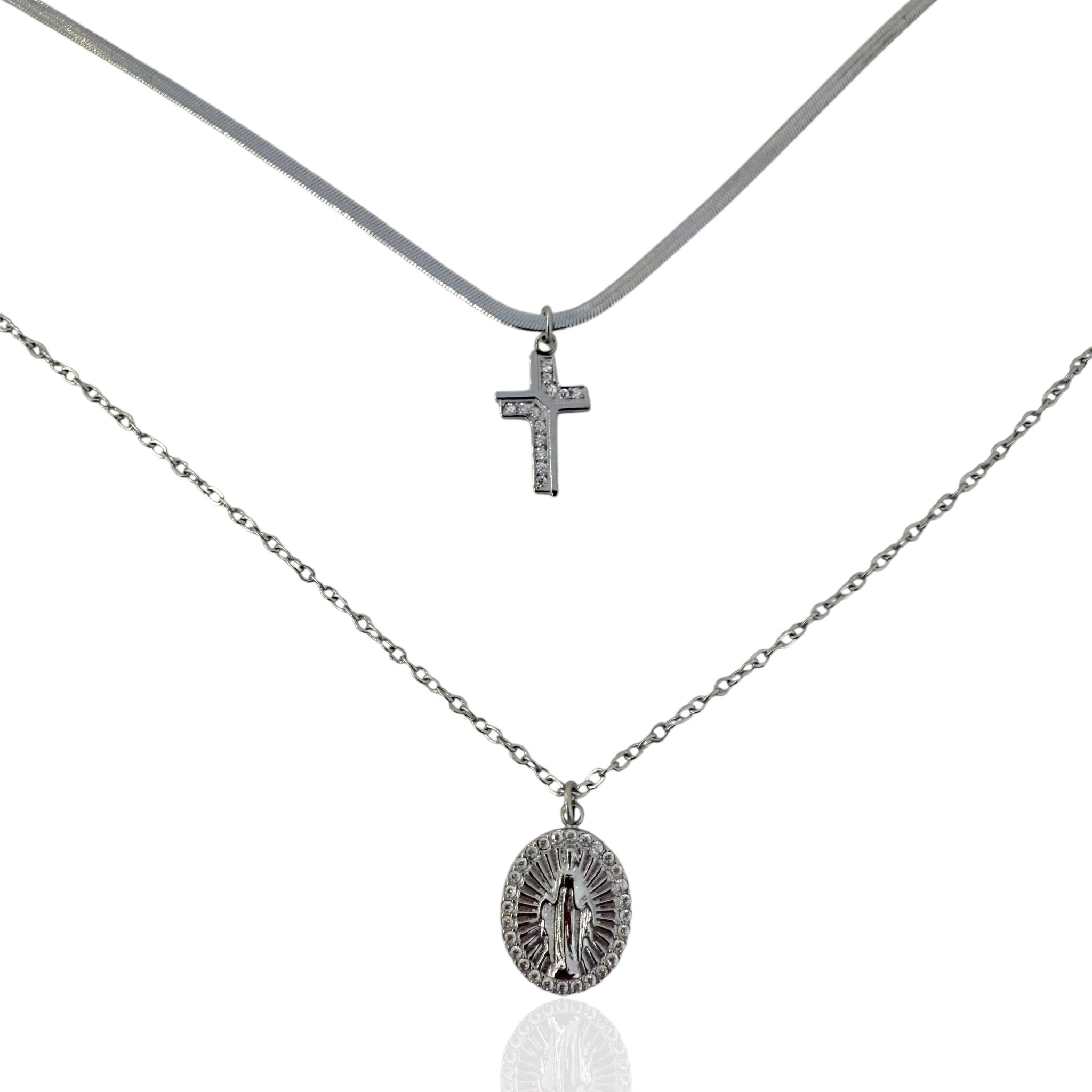 Un gioiello che unisce eleganza e significato: la Collana 2 in 1 Double Charm Silver è composta da due catene delicate, arricchite da ciondoli simbolici che raccontano luce, fede e protezione. La croce impreziosita da zirconi dona un tocco di brillantezza raffinata, mentre la medaglia sacra trasmette un senso di autenticità e spiritualità.