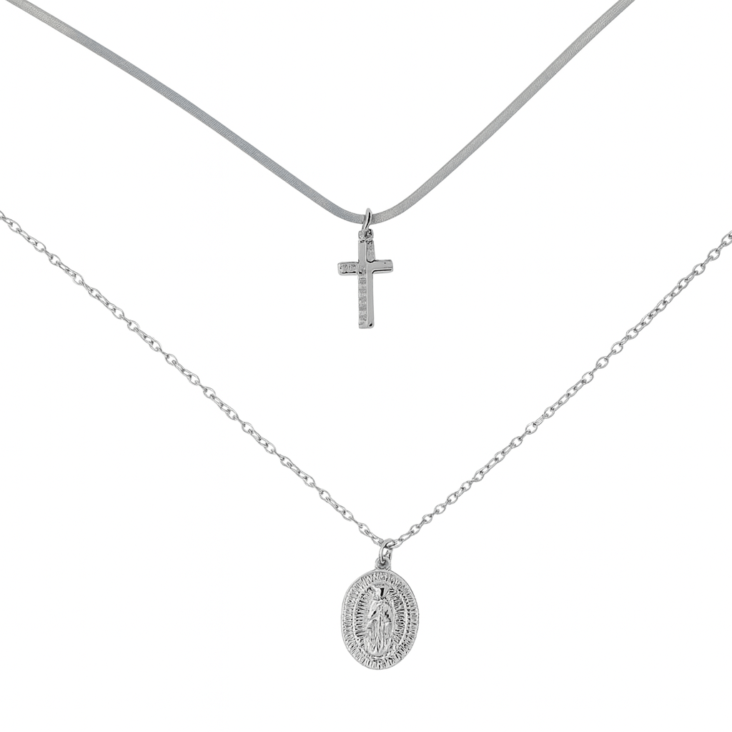 Un gioiello che unisce eleganza e significato: la Collana 2 in 1 Double Charm Silver è composta da due catene delicate, arricchite da ciondoli simbolici che raccontano luce, fede e protezione. La croce impreziosita da zirconi dona un tocco di brillantezza raffinata, mentre la medaglia sacra trasmette un senso di autenticità e spiritualità.