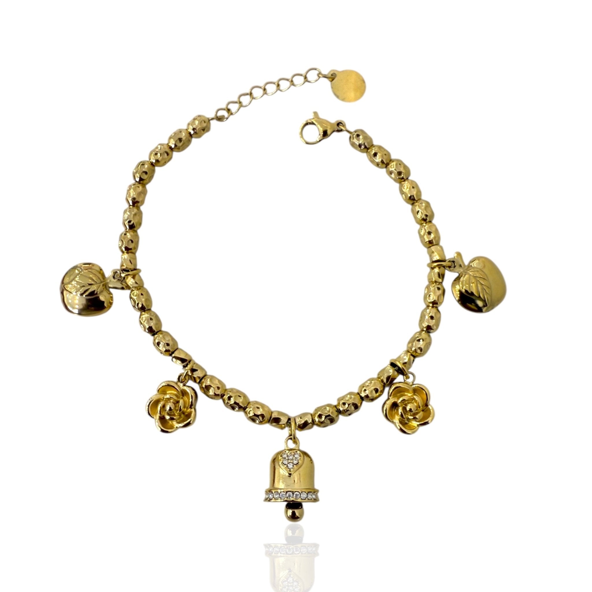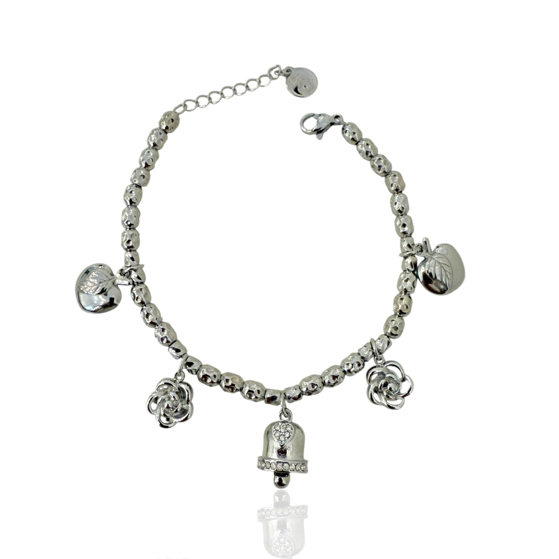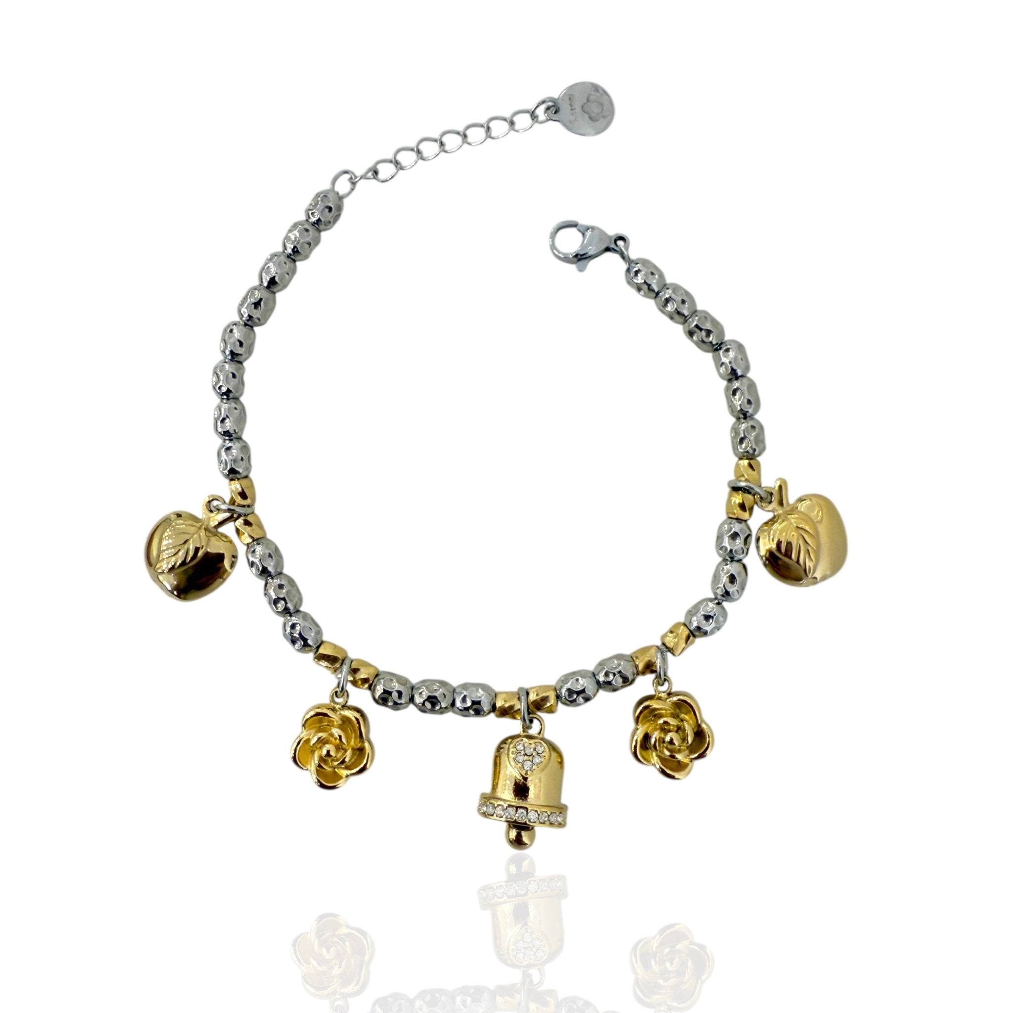 Il bracciale donna elegante con charm “Campanella Sonaglio” è un gioiello dal carattere unico, che unisce tradizione e modernità. Le sfere lucide alternano toni silver e gold, mentre i ciondoli pendenti – cuori, rose e la campanella centrale decorata con zirconi – creano un movimento delicato e luminoso.